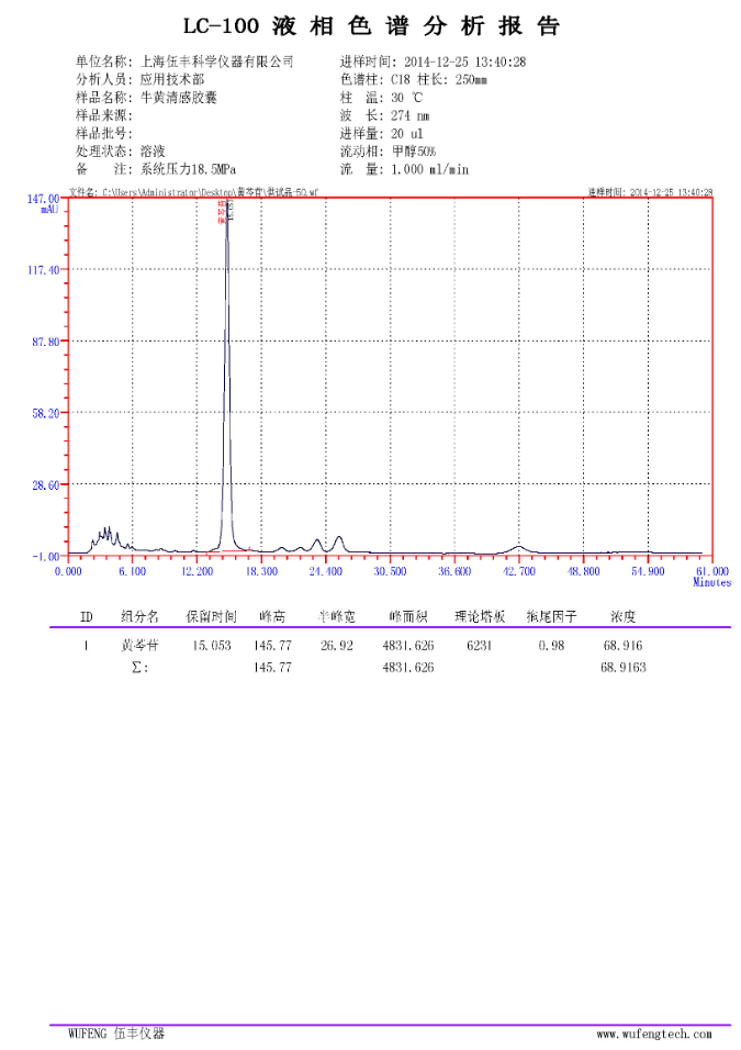 測得的稀釋一倍后的供試品濃度為68.916%,即供試品原溶液的濃度是標準品溶液的137.832%,按照標準品的說明書,標準品含量按93.3%計算,配置的標準品溶液實際濃度為0.9*10-4g/ml.?即標準品實際含量為0.8397*10-4g/ml.?計算可得,樣品溶液(0.7g/50ml)實際黃芩苷總含量為0.0289克,每粒(0.3g)含量為12.40mg,達到了藥典規定每粒含量10mg的要求。